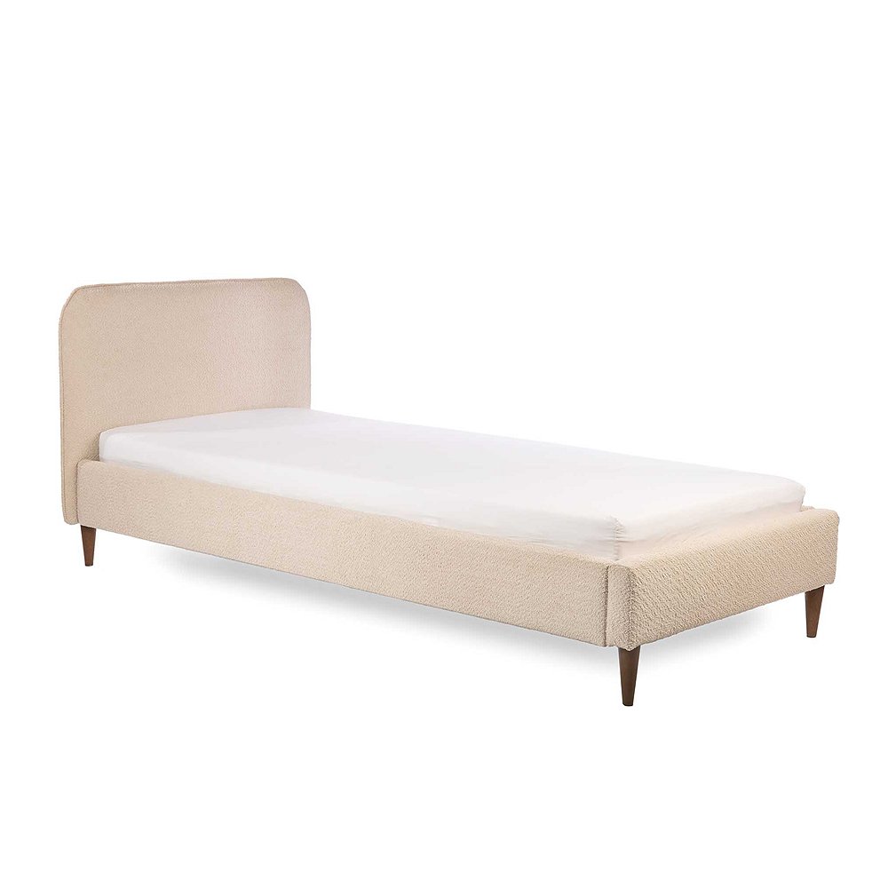 Luxuriöses, hübsches -Polsterbett Juna von kidsdepot und alle werden es lieben, die sich abends an das schöne Boucle Polster kuscheln... Ganz egal ob du noch lesen möchtest, oder du an deinem Laptop noch eine Email erledigst, die gepolsterte Rückwand gibt dir idealen Halt und ist ganz einfach ideal dafür. Das Modell Juna ist nicht nur hochwertig verarbeitet, sondern auch super bequem. Das abgerundete Kopfteil, der moderne Bouclebezug, die zurückhaltende Farbe, das klare Design machen das Bett zu einer wunderbaren Ruhezone und einem leicht zu kombinierenden Möbelstück. Ein Bett für das Gäste- oder Jugendzimmer oder einfach für dich selber. Das Bett ist in drei unterschiedlichen Größen lieferbar - es stehen 90 cm, 120 cm und 140 cm zur Verfügung. Der Bezugsstoff Bowi in einem hellem Sandweiß ist aus einer angenehmen Kunstfaser hergestellt. Die Holzbeine sind holzfarben, farblos gestrichen und bilden einen tollen Mix mit dem hellen Stoffbezug.  Der Lieferumfang beinhaltet nur das Bettgestell. Auf Wunsch kannst du unterhalb der Artikelbeschreibung den passenden Lattenrost mit Rahmen sowie eine Schaummatratze zu dem von dir gewünschten Modell auswählen. Eine genaue Aufbauanleitung für das Polsterbett Juna von kidsdepot liegt bei. - Und damit du auch garantiert den schönsten Farbton und die beste Qualität für dein neues Bett findest - schicken wir dir gerne auf Anfrage ein kleine Stoffprobe zu.