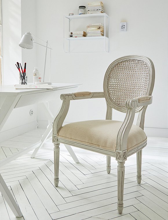 Süßer Polsterstuhl mit Armlehnen im shabby chic - toll für den Esstisch und prima für den Schreibtisch zu gebrauchen. Unkompliziert und einfach zu kombinieren, besonders edel weiß in weiß. Der hübsche Stuhl lässt sich entspannt mit modernen Möbeln stellen und wirkt dabei selbstverständlich, locker und leicht. Er hat ein gemütliches Polster aus Schaumstoff, ist mit hellem Leinen bezogen, eine Rückenlehne aus Geflecht und bietet uns nicht zuletzt durch die Armlehnen hervorragenden Sitzkomfort. Der solide Rahmen aus Mahagoniholz hat geschnitzte Elemente und ist liebevoll im used look gestrichen. Der Holzstuhl ist 102 x 64 x 63 cm groß und hat eine Sitzhöhe von ... Der Stuhl wird fix und fertig montiert geliefert -einfach auspacken und draufsetzen. Der feine Polsterstuhl mit Armlehnen lässt keine Wünsche offen, wir wünschen Ihnen viel Spaß damit.
