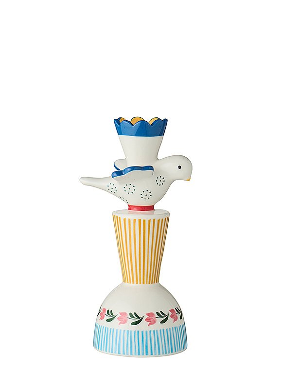 Maße (HxTxB): mit Vogel: 20,5 x 8,4 x 10 cmrot/grünes Muster: 22 x Ø10 cmblau/gelbes Muster: 10 x 11 x 12,5 cmGeeignet für handelsübliche Stabkerzen (Ø2,2 cm)Material: Keramik