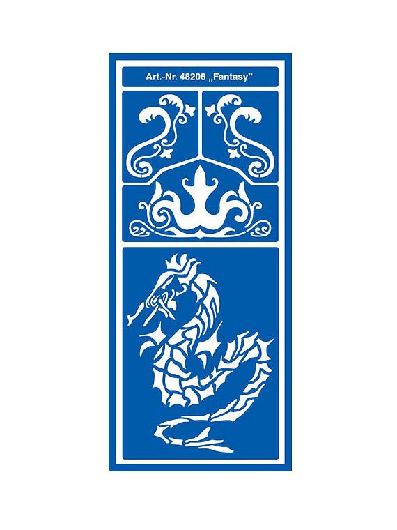 Mit diesen Schablonen können Sie leicht Wände, Möbel etc. verzieren. Die Schablonen sind selbstklebend und dadurch ist es sehr einfach, die verschiedensten Sachen zu schablonieren. Wir bieten vier verschiedene Schablonen an: Elegance (Krone mit Lilien), Fantasy (Drachen und Ornamente), Little Princess (große Krone mit Schriftzug) und Little Pirate (Piratenflagge). Zu den Schablonen bieten wir Ihnen als Zubehör auch gleich spezielle Schablonenfarbe (Acrylfarben schnell trocknend auf Wasserbasis), Pinsel und Rollen an.