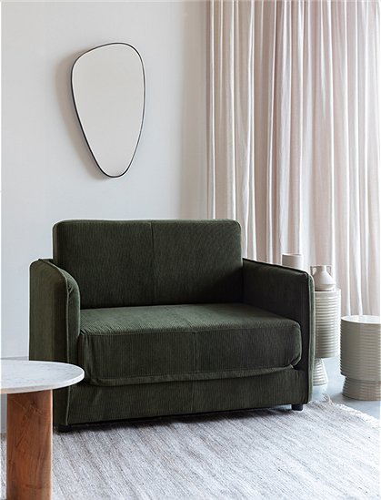 Ein Highlight für gemütliche Stunden und erholsamen Schlaf - das ist der Schlafsessel Jopie mit Cordbezug. Denn Jopie ist nicht nur ein Love Seat, sondern auch ein praktisches Schlafsofa mit 2-in-1-Funktion, perfekt für kleine Räume, Jugend- oder WG-Zimmer. Der Sessel ist mit einem bequemen Cordbezug aus Baumwolle und Kunstfaser in den zeitlosen Farben Beige oder Grün erhältlich. Die Cordoptik liegt voll im Trend und bringt eine lässige Note in jeden Raum. Die Farben sind nicht nur zeitlos, sondern auch gut kombinierbar, um deinem persönlichen Stil Ausdruck zu verleihen. Der Cordsessel ist stylisch und äußerst komfortabel gepolstert. Wird eine zusätzliche Schlafgelegenheit benötigt, einfach die Sitzfläche als Matratze aufklappen – schon verwandelt sich der Sessel in ein gemütliches Schlafsofa. Die Liegefläche beträgt großzügige 196x109 cm und ist 22 cm hoch, perfekt für eine erholsame Nachtruhe. Die Anlieferung erfolgt bequem per Spedition, damit du deinen neuen Schlafsessel stressfrei in Empfang nehmen kannst. Genieße entspannte Sitzmomente und habe gleichzeitig immer auch einen perfekten Schlafplatz für dich und deine Gäste parat. Zeitloses Design, platzsparend und multifunktional – der Schlafsessel Jopie mit Cordbezug macht dein Zuhause noch gemütlicher!