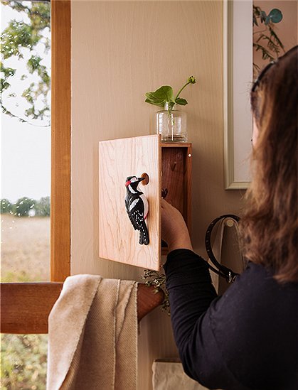 Nie wieder Schlüssel suchen...! Der Handgefertigte Schlüsselschrank Specht von Wildlife Garden ist 25 x 12 x 19,7 cm groß, aus Kirschholz gefertigt und sorgt dafür, dass deine Schlüssel einen festen Platz hat. Auf der Tür sitzt ein kunstvoll geschnitzter Holzvogel, ein kleiner Specht dient hier als Griff. Der Schrank hat ein traditionelles Leinöl-Finish, das die Messingscharniere hervorhebt und das feine Kirschholz hat eine schöne Maserung, reift mit der Zeit und bekommt einen warmen, rötlichen Farbton der nach und nach etwas dunkler wird. Die schöne Maserung weist dunklere Akzente auf, die durch Harztaschen entstehen. Der süße Vogel ist von Hand auf wasserbasis bemalt. Die Schranktür ist mit Magneten versehen, durch die sie sich mühelos öffnen und schließen lässt. Eine kleine Schwelle im Inneren des Schranks verhindert, dass dir etwas herausfällt. Im Inneren befinden sich sieben Stifte in zwei Reihen, die somit alle deine Schlüssel in Ordnung halten. Hab viel Spaß an dem süßen Schlüsselschrank Specht von Wildlife Garden.Details: