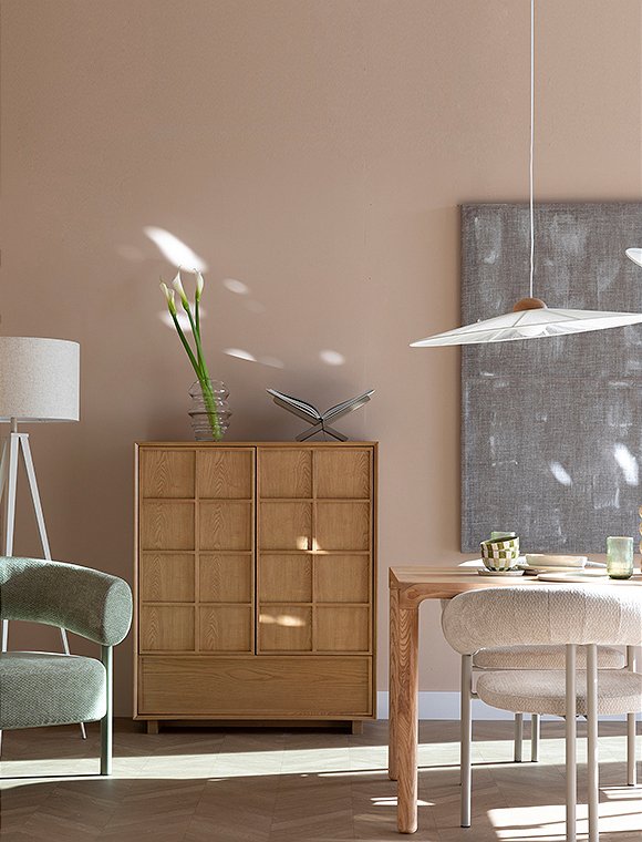 Zurückhaltend, aber wirkungsvoll - der Schrank Raster in natur von Zuiver ist ein echtes Statement im Japandi-Stil – klar, reduziert und voller Ruhe. Zwischen Zen und Hygge vereint dieses Möbelstück japanische Handwerksästhetik mit skandinavischer Gemütlichkeit und schafft eine Atmosphäre, die Gelassenheit ausstrahlt. Charakteristisch für die Raster-Serie sind die feinen Holzlamellen auf Türen und Schubladen. Sie bilden ein rautenförmiges Muster, das je nach Lichteinfall ein wunderschönes Spiel aus Licht und Schatten erzeugt. Die schlanken, geraden Beine heben den Schrank leicht vom Boden ab und verleihen ihm eine elegante Leichtigkeit – minimalistisch, aber mit viel Liebe zum Detail. Der Schrank mit den Maßen 120x45x100 cm hat zwei Türen mit drei Fächern dahinter. Darunter befindet sich eine breite grifflose Schublade. Viel Stauraumund eine praktische Unterteilung für Geschirr, Deko, Textilien und vieles andere mehr. Entdecke auch das passende Sideboard Raster in zwei verschiedenen Ausführungen in unserem Sortiment.  Gefertigt aus massiver Esche mit natürlicher Oberfläche überzeugt Raster durch Qualität, Langlebigkeit und eine warme, authentische Ausstrahlung. Ob als Sideboard, Lowboard oder Aufbewahrungsschrank – mit Raster bringst du Struktur, Stil und eine ruhige Japandi-Atmosphäre in dein Zuhause. Ein Must-have für alle, die Ordnung lieben und auf zeitloses Design setzen. Der Schrank Raster in natur von Zuiver wird per Spedition geliefert.