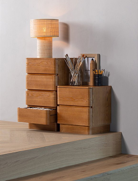 Stilvolle Schubladenkommode Fejo in braun von woood. Die Fejo Kommode der niederländischen Einrichtungsmarke bringt Wärme und Gemütlichkeit in deinen Wohnraum. Sie verbindet Funktionalität mit einer einladenden Ausstrahlung, die deinem Zuhause sofort eine gemütliche Atmosphäre verleiht. Fejo ist wahlweise mit zwei (43x34x40 cm) oder vier Schubladen (70x34x40 cm) erhältlich. Die kleinere Kommode eignet sich perfekt für das Schlafzimmer als Nachttisch, während beide Varianten auch im Wohnzimmer mit ihren geräumigen Schubladen für zusätzlichen Stauraum sorgen. Die braun lackierte Kommode besteht aus MDF-Holz aus FSC-zertifiziertem Anbau und passt gut zu verschiedenen Wohnstilen. Durch ihr kompaktes Format lässt sich die Kommode leicht platzieren, auch in kleineren Räumen. Die Schubladenkommode Fejo in braun von woood fühlt sich an wie ein vertrauter Freund, der deine Sachen ordentlich aufbewahrt und gleichzeitig deine Einrichtung vervollständigt. Das Modell wird fertig montiert zu dir nach Hause geliefert.