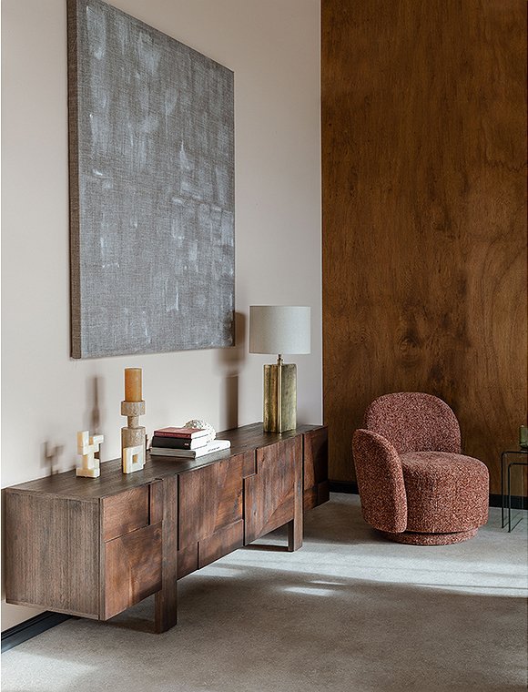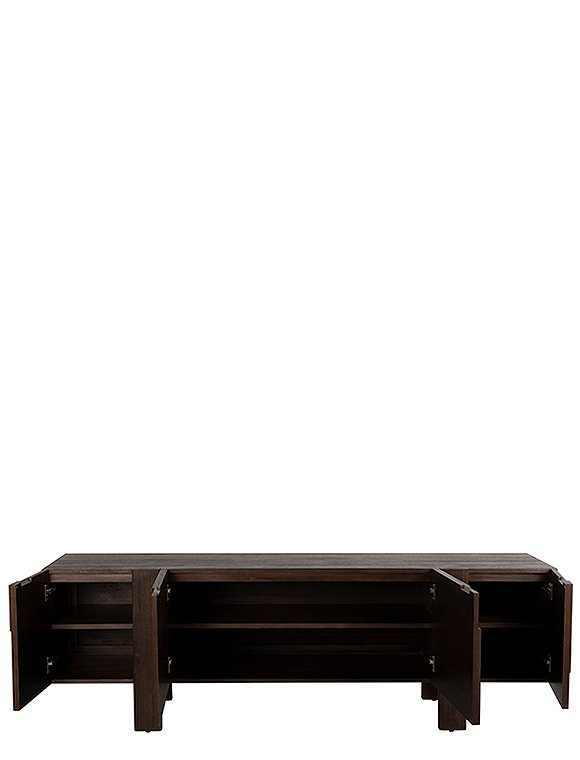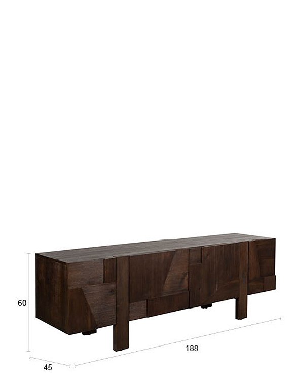Mit dem Sideboard Bruneau, 60x45x188 von Dutchbone holst du dir ein echtes Highlight in dein Zuhause. Auf vier massiven Holzbeinen stehend, kombiniert es Gummibaum- und Akazienholz zu einem robusten Möbelstück mit Charakter. Die walnussfarbene Oberfläche betont die natürliche Maserung des Holzes und sorgt für ein warmes, gemütliches 60er-Jahre-Flair. Die vier Türen mit schmalem Eingriff oben verbergen hinter der mittleren Sektion zwei längliche Fächer und rechts sowie links hinter je einer Tür noch jeweils zwei schmale Fächer – ideal, um Ordnung stilvoll zu bewahren. Abstrakte Oberflächen und geometrische Formen verleihen deinem Interieur sofort einen extravaganten Touch und machen das Sideboard zu einem echten Blickfang. Bruneau ist nicht nur als Sideboard erhältlich, sondern auch als Couchtisch – perfekt, um den einzigartigen Look konsequent in deinem Zuhause fortzusetzen. Das Sideboard Bruneau, 60x45x188 von Dutchbone wird fertig montiert per Spedition geliefert und bringt Wärme und Charakter in dein Zuhause. Details:
