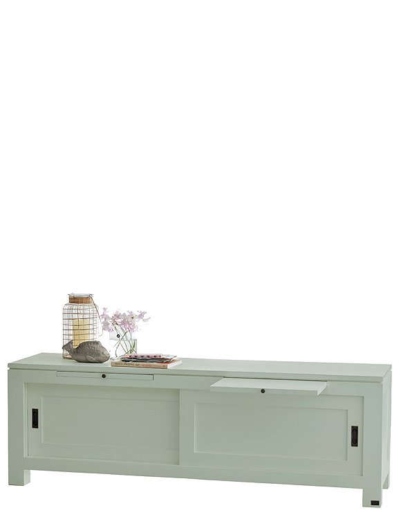Dekorativ und praktisch: Das Sideboard aus Massivholz kann zu Aufbewahrungszwecken in Wohnbereichen oder Schlafzimmern zum Einsatz kommen und mit Hilfe der großzügigen Ablagefläche ein schöner Blickfang sein. Alles was du dafür benötigst sind Bilder, Pflanzen oder persönliche Gegenstände, die das Sideboard charmant hervorheben. Durch die optimale Höhe von circa 50 Zentimetern eignet sich das Modell auch prima als TV-Board. Fernsehgerät und weitere technische Raffinessen finden darauf ausreichend Platz. Zudem bietet die Fläche, die mit zwei Schiebetüren versehen wurde Stauraum für CDs und DVDs oder kann mit Büchern befüllt werden. Zwei Auszüge befinden sich weiter oben an dem Modell und sorgen für ein weiteres Deko-Highlight, das gleichzeitig das Möbelstück noch attraktiver macht. Das Sideboard ist in 16 Farben erhältlich. Alle Farben lassen sich prima zu bestehenden Einrichtungsgegenständen ergänzen und bestechen durch ihr zeitloses Design. Auch in Sachen Wohnstil lässt sich das hübsche Möbel flexibel einsetzen. Scandi Chic, Landhausstil und das beliebte Industrial Design – zu all diesen Stilen kann das kompakte Möbel eingesetzt werden. Bei dem Sideboard aus Massivholz handelt es sich um ein exklusives car Möbel-Modell, das fertig montiert zu dir nach Hause geliefert wird und dort sofort aufgestellt und eingeräumt werden kann. Bitte beachte, dass alle bunten Farben (ausgenommen in weiß), eine Sonderanfertigung für dich sind - und somit leider vom Umtausch ausgeschlossen - Gerne senden wir dir auf Anfrage eine Farbprobe zu.