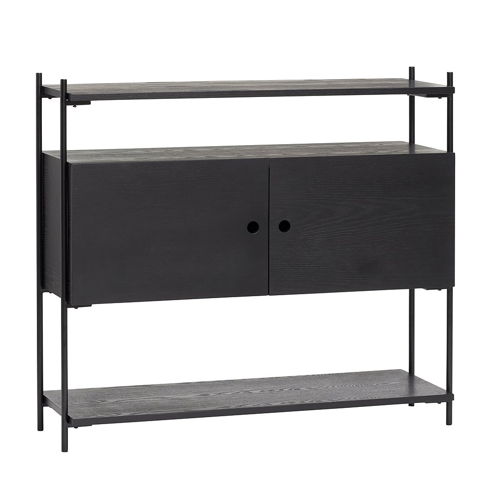 DIESER ARTIKEL IST NUR 1x VERFÜGBAR! SOLLTE DER ARTIKEL MEHRFACH BESTELLT WERDEN BEKOMMT DER 1.BESTELLER DEN ZUSCHLAG!!! BITTE BEACHTEN SIE: Die rechte Tür hat Stoßstellen.Dieser Artikel ist von der Rücknahme und vom Umtausch ausgeschlossen!!!Da passt viel drauf - da geht viel rein... schwarzes Sideboard mit Türen von HÜBSCH Interior. Der schöne, moderne Konsolentisch hat einen Rahmen aus lackiertem Metall und einen Korpus aus lasiertem Eschenholz. Das geradlinige Möbel lässt sich prima kombinieren und eignet sich perfekt für Flur, Schlaf- und Wohnzimmer. Hinter den Türen befindet sich ein einfacher Einlegeboden auf dem sich Bücher, Vasen und jede Menge Krimskrams verstauen lässt - Dekoratives findet in den beiden offenen Fächern und auf der oberen Ablagefläche Platz. Das Regal ist 90 x 35 x 103 cm groß, passt in kleine Räume und wird teilmontiert geliefert. Das schwarze Sideboard mit Türen von HÜBSCH Interior ist ein gelungener Entwurf des Skandinavischen Labels, wir wünschen viel Freude damit!Details:
