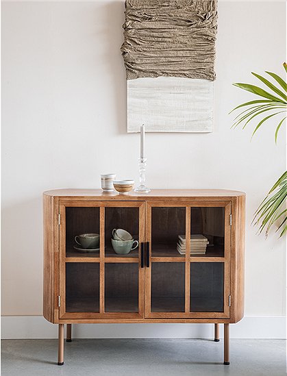 Alles erkennen! Das Sideboard Yaz high von White Label Living hat zwei schöne Vitrinentüren und ein praktisches Einlegebrett auf denen du jede Menge verstauen kannst. Toll für Geschirr, Bücher, T-Shirts oder auch Pullover. Die Holzkommode lässt sich prima kombinieren, hat die Maße 80 x 38 x 100 cm und kann mit bis zu 20 Kg belastet werden. Der Schrank mit den leicht geschwungenen Seitenteilen in Lamellenoptik wird teilmontiert geliefert - aber keine Angst es müssen lediglich die Beine darunter geschraubt werden. Er ist aus Gummiholz gearbeitet und hat eine feine Maserung - die Metallfüße sind passend zum Holz lackiert. Schaffe eine schöne Ordnung mit dem