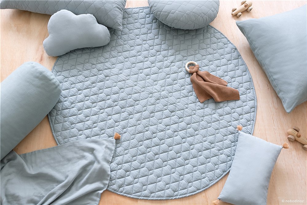 Wunderschöne Struktur. Der Spielteppich Kiowa von Nobodinoz überzeugt mit seiner besonders schönen Oberfläche in zarten Pastellfarben, die mit hübschen Mustern charmant abgesteppt ist. Die kreisrunde Spielmatte mit einem Durchmesser von 105 cm ist mit einer Füllung aus Polyester weich gepolstert. Damit wird sie schnell zum Liebling aller Kids und Eltern, die sich auf dem Kinderzimmer Fußboden zum Spielen treffen. Die gesteppte Textur aus Bio-Baumwolle ist aus OEKO-TEX®-zertifiziertem Stoff gefertigt und besonders hochwertig verarbeitet. Wir bieten den Teppich in den Farben blau, grün rosa und Natur an. Das Steppmuster variiert je nach Bezugsfarbe in Form von Wellen, Zickzack oder hübschen Rhomben. Kombiniere die runde Spielmatte mit weiteren Kissen, den passenden Spielmatratzen, einem Kinderzelt oder Betthimmel und schaffe so eine gemütliche Wohlfühlatmosphäre mit wunderschönem Design im Kinderzimmer deiner Liebsten. Wir wünschen viel Freude mit dem Spielteppich Kiowa von Nobodinoz.