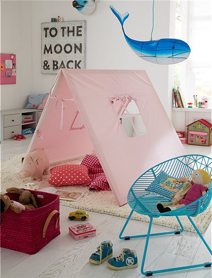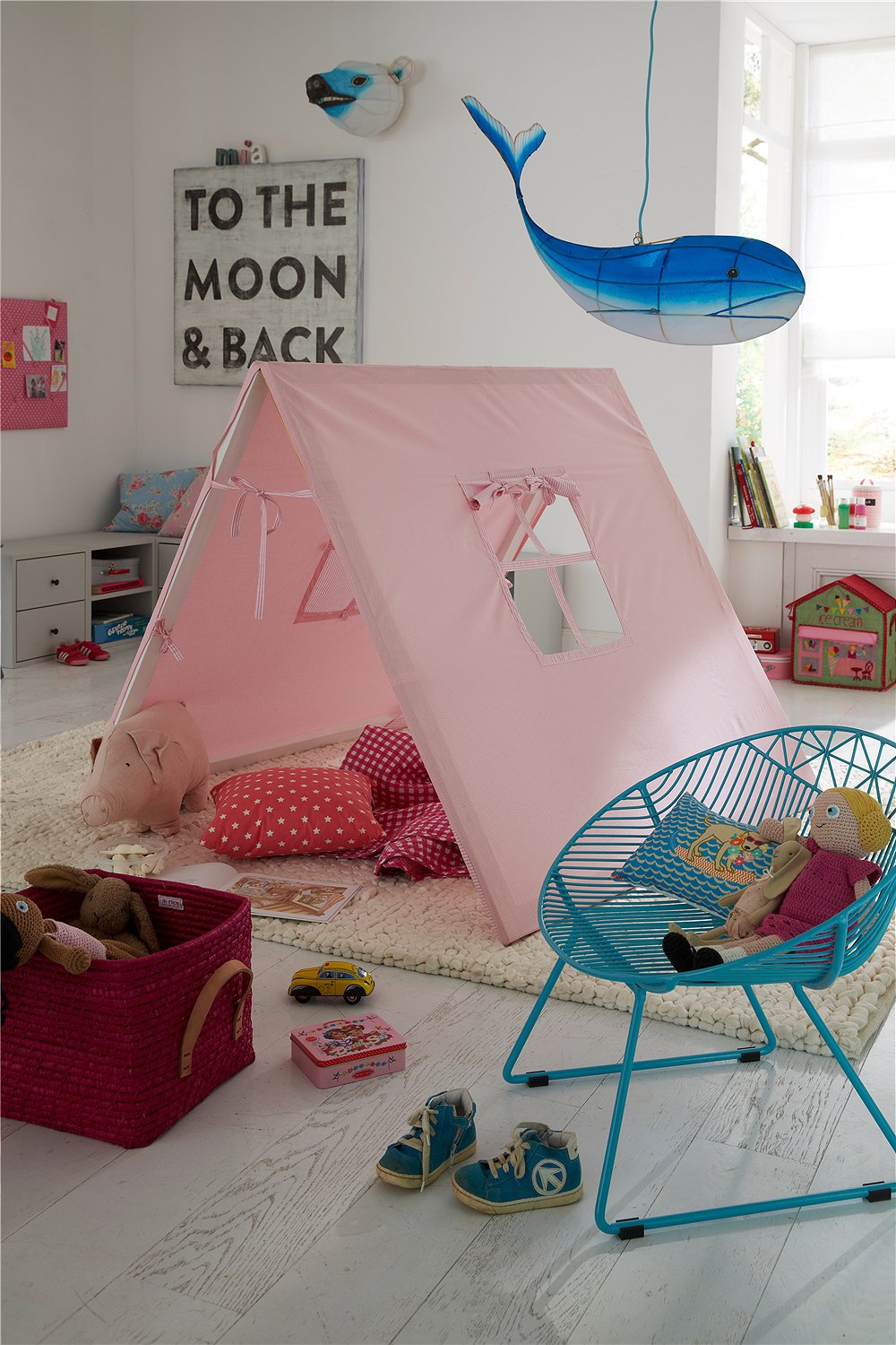 Mit dem Spielzelt Kinder von car Möbel werden Mädchenträume wahr. Der Traum in rosa lädt zum Spielen, Kuscheln und Entspannen ein und ist der optimale Rückzugsort für den Nachwuchs. Dabei kann das Zelt zum festen Inventar des Kinderzimmers werden oder nach dem Spielen im Handumdrehen von den Eltern abgebaut und anschließend leicht verstaut werden. Damit auch genügend Licht in das Zelt fällt, lassen sich die Stofffenster auf beiden Zeltseiten aufrollen, was zudem auch sehr dekorativ aussieht. Um den neuen Lieblingsplatz des Nachwuchses komplett zu machen, sollten unbedingt kuschelige Decken und Kissen darin platziert werden. Sie sorgen für Gemütlichkeit und lassen die Kinder gar nicht mehr das kleine Häuschen verlassen. Das Spielzelt Kinder besteht aus einem Holzrahmen mit Baumwollüberzug und kommt im eingeklappten Format nach Hause geliefert.
