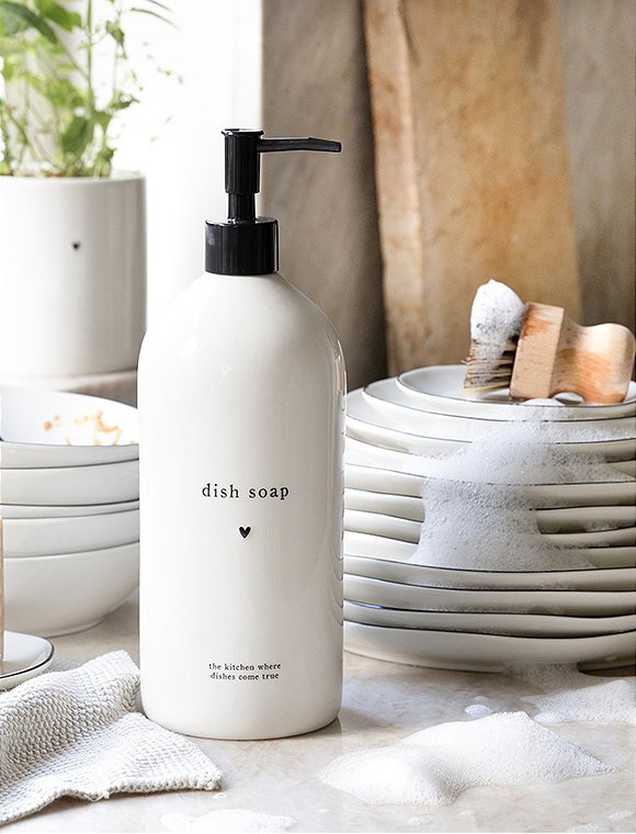 Mit dem Spülmittelspender, 27 cm aus Keramik von Bastion Collections wird der Abwasch zu einem kleinen Wohlfühlmoment in deiner Küche. Die runde Flasche aus weißer Keramik hat einen Durchmesser von 8,5 cm und überzeugt durch ihr zeitloses, skandinavisch inspiriertes Design. Der schwarze Pumpspender sorgt dafür, dass du dir ganz unkompliziert zwei oder drei Pumpstöße Spülmittel nehmen kannst – sauber, schnell und ohne Kleckern. Auf der Vorderseite steht schlicht „Dish Soap“, darunter der charmante Spruch „the kitchen where dishes come true“, der deiner Spüle eine persönliche und freundliche Note verleiht. Der Spender ist nicht nur praktisch für Spülmittel, sondern eignet sich auch hervorragend für Handseife oder andere Flüssigseifen in der Küche. So macht das Abwaschen gleich ein bisschen mehr Spaß und deine Arbeitsfläche wirkt aufgeräumt und stilvoll. Eine perfekte Ergänzung ist das ovale Tray mit den Maßen 12 x 17 cm. Darauf findet der Spülmittelspender genau seinen Platz, und daneben bleibt genug Raum für einen Schwamm oder eine Bürste. Zusammen entsteht ein harmonisches Ensemble, das Funktionalität und Design verbindet und deine Küchenspüle optisch aufwertet. Wir wünschen viel Spaß beim Abwaschen mit dem Spülmittelspender 27cm, Keramik von Bastion Collections - ein perfekter Helfer!Details: