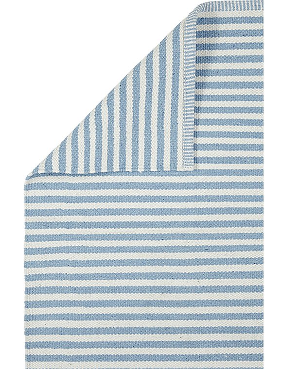 Klassischer Streifenteppich von liv interior aus recycelter Baumwolle für Flur, Kinder-, Wohn- und Esszimmer. Die süßen Teppiche passen eigentlich immer, denn ihr hübscher Streifen ist ein absoluter Gewinn für jeden Raum. Der fröhliche Look lockert die Stimmung und hält grafisch alles nett zusammen. Der süße Bodenbelag ist in vier unterschiedlichen Größen und in drei unterschiedlichen Farben - hellblau, beige, und schwarz in Kombination mit offwhite - erhältlich. Die Baumwolle ist so schön weich und angenehm, dass sie sich für Barfußläufer prima eignet. Toll auf Parkett, Fliesen oder Linoleum am besten mit einem kleinen Antirutschschutz unterlegen, fertig. Der Baumwollteppich kann mit einem sanften Fleckenreiniger gesäubert werden. Der Streifenteppich von liv interior aus recycelter Baumwolle ist ein echtes Lieblingsstück - wir wünschen ihnen viel Freude damit!