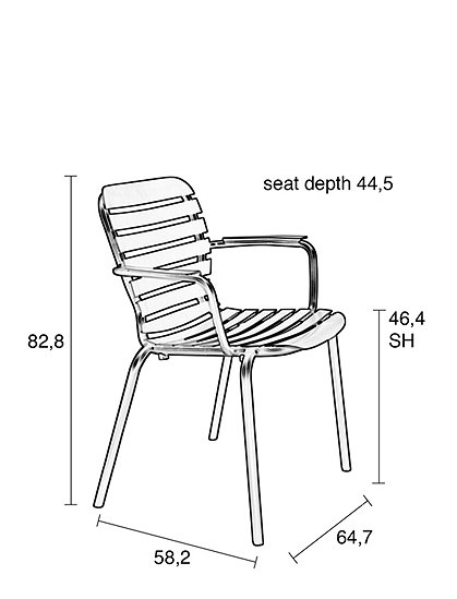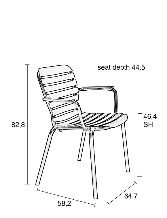 Super für draußen! Der Stuhl mit Armlehnen Vondel von Zuiver der Dank seiner Oberfläche aus pulverbeschichtetem Aluminium sehr, sehr widerstandsfähig ist. Der hübsche, moderne Metallstuhl mit Sprossen ist perfekt für deinen Garten, Terrasse oder den Balkon - schön, dass es ihn in drei unterschiedlichen Farben gibt! Der Stuhl ist 82,8 x 58,2 x 64,7 cm groß und hat einer Sitzhöhe von 46,4 cm und eine Sitztiefe von 44,5 cm - der Stuhl wird montiert geliefert, und wird mit praktischen Gleitern unter den Füßen versand. Passend zu diesem Design gibt es noch Tisch, Bank und einen Stuhl ohne Armlehnen - selbstverständlich in unterschiedlichen Größen und in den Farben off white, grün und schwarz. Wir wünschen dir einen großartigen Sommer mit dem zeitlosen Stuhl mit Armlehnen Vondel von Zuiver!Details: