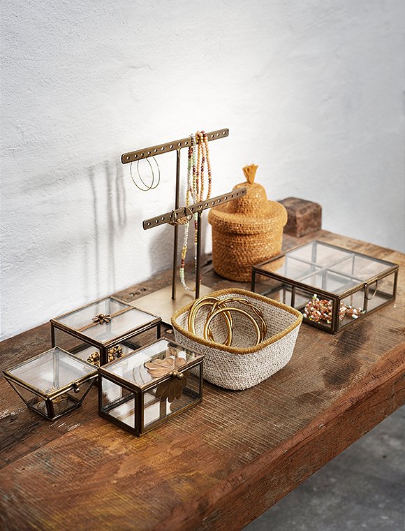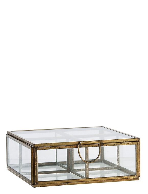 Unterteilte Glasbox von Madam Stoltz - für durchdachte Ordnung! In diesem formschönen, unterteilten Glaskasten finden kleine Schätze ein ruhiges und geordnetes Zuhause. Hergestellt in Indien bringt es Ordnung auf Schminktische, Schreibtische und Regale. Die Glasbox mit Fächern bietet die perfekte Organisation selbst kleinster Gegenstände im Haushalt. Ihr antiker Look unterstreicht die handwerkliche Perfektion und macht sie ideal zum Ordnen und Aufbewahren von Schmuck oder anderen wertvollen Erinnerungsstücken. Sie spiegelt die Werte von Madam Stoltz wider: Schlichtheit und Authentizität. Die Box fügt sich nahtlos in verschiedene Umgebungen ein und bietet sowohl ästhetische als auch funktionale Vorteile. Das Kästchen besteht aus Glas und Eisen hat eine klare und gealterte Messingoberfläche. Diese unterteilte Glasbox vereint traditionelle Glas- und Eisenverbindungen zu einem leichten und dennoch robusten Rahmen mit einer klaren, gealterten Messingkante. Die handgefertigten Scheiben bilden vier ruhige Fächer, die jeweils einen transparenten Blick auf Schmuck, Erinnerungsstücke oder Alltagsgegenstände ermöglichen. Feine Unregelmäßigkeiten in Glas und Metall zeugen von handwerklichem Können, während der klare, gealterte Messington modernen wie auch Vintage-Interieurs eine sanfte Wärme verleiht. Hab viel Spaß an der süßen unterteilte Glasbox von Madam Stoltz.Details: