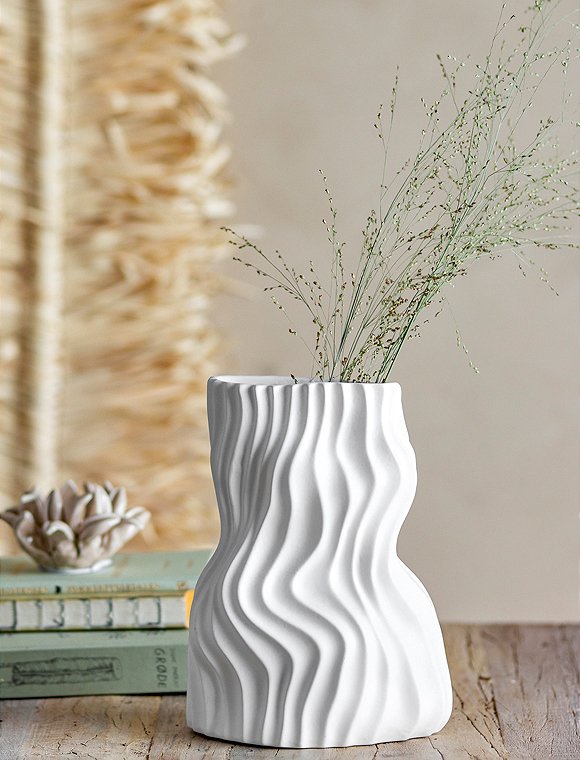 Die Vase Sahal, in weiß aus Keramik von Bloomingville hat eine matte weiße Glasur. Die Textur der Vase ist von den Wellen des Meeres inspiriert und fügt deinem Zuhause ein Gefühl der Ruhe hinzu. Sahal eignet sich perfekt für farbenfrohe Blumen, kann aber auch vorteilhaft für getrocknete Blumen und Zweige verwendet werden, oder auch ganz ohne Inhalt als dekoratives Element im Interieur. Mit ihrer organischen Form und den Maßen 25,5x15x19 cm ist das Modell ein schöner Blickfang auf jedem Ess- oder Beistelltisch sowie auf Kommoden oder Sideboards. Mit der Vase Sahal, in weiß aus Keramik von Bloomingville zieht ein wunderschönes Wohnaccessoire bei dir zuhause ein. Wir wünschen viel Freude damit.