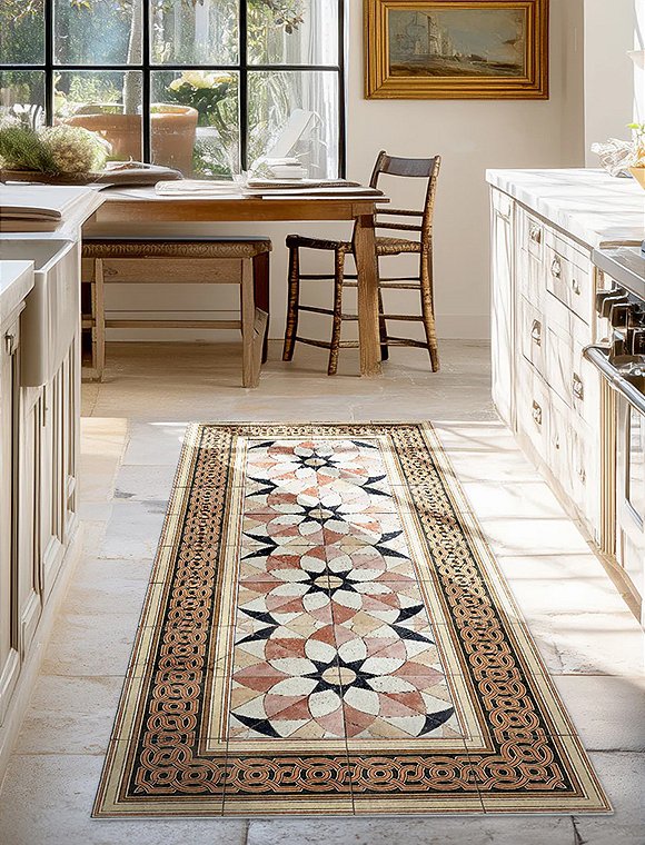 Verleihe deinem Zuhause einen Hauch von italienischer Eleganz – mit der Vinylmatte Palazzo Opal von Beija Flor. Das beeindruckende Mosaikdesign erinnert an kunstvolle Bodenornamente alter Palazzi und bringt mediterranen Charme in deine vier Wände. Sanfte Sand-, Creme- und Terrakottatöne verschmelzen mit feinen Schwarz- und Grauakzenten zu einem harmonischen, edlen Muster, das Wärme und Stil ausstrahlt. Die Palazzo Opal ist in drei wunderschönen Formaten erhältlich: ganz neu, als runde Version mit einem Durchmesser von 126 cm, perfekt für den Eingangsbereich oder als Blickfang im Wohnzimmer, als schmaler Läufer mit 1950x80 cm, ideal für Küche oder Flur, oder etwas breiter mit 195x120 cm – für ein großzügigeres Raumgefühl. Und wenn du noch mehr Möglichkeiten suchst: Das beliebte Design Palazzo Opal findest du auch in der Modular-Serie von Beija Flor – dort kannst du aus vielen weiteren Formaten wählen und dein ganz persönliches Mosaikensemble gestalten. Verleihe deinem Zuhause seinen ganz individuellen Charme. Der perfekte Druck macht die Matten zu einer guten Alternative zu einem neuen Fußboden und auf Holz oder einfachen Fliesen sind sie besonders attraktiv. Oft reicht schon eine kleine Vinylmatte aus um das Gesicht des Raumes zu verändern, und man kann sich das mühevolle Herausreißen des Fußbodens ersparen. Gereinigt wird die bedruckte Matte einfach mit Wasser und Seife. Die Vinylmatte Palazzo Opal von Beija Flor ist mehr als nur eine Matte, sie ist ein Statement für Geschmack und zeitlose Schönheit.