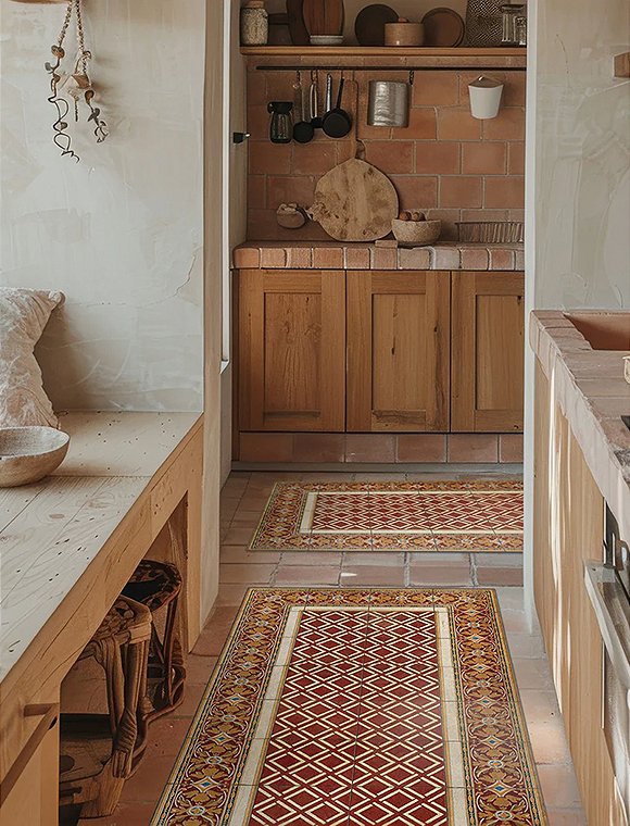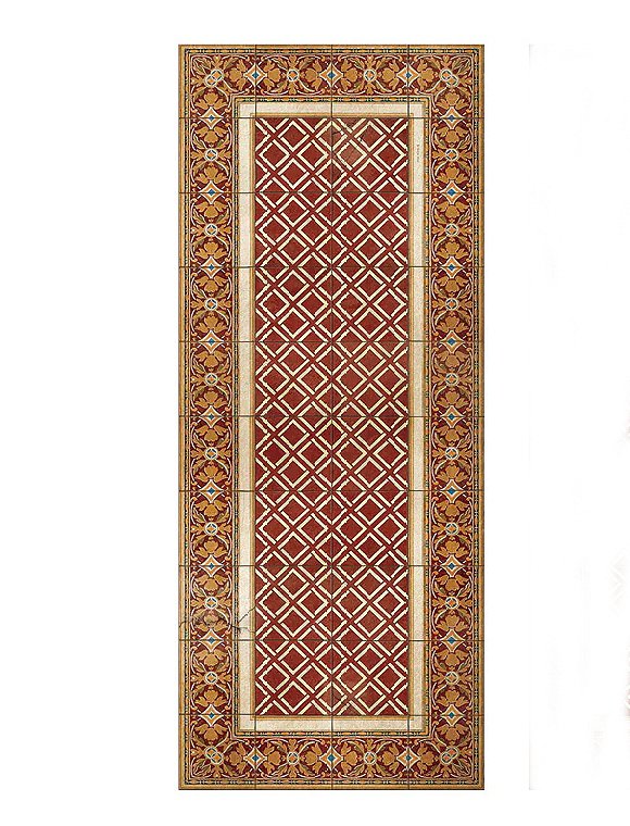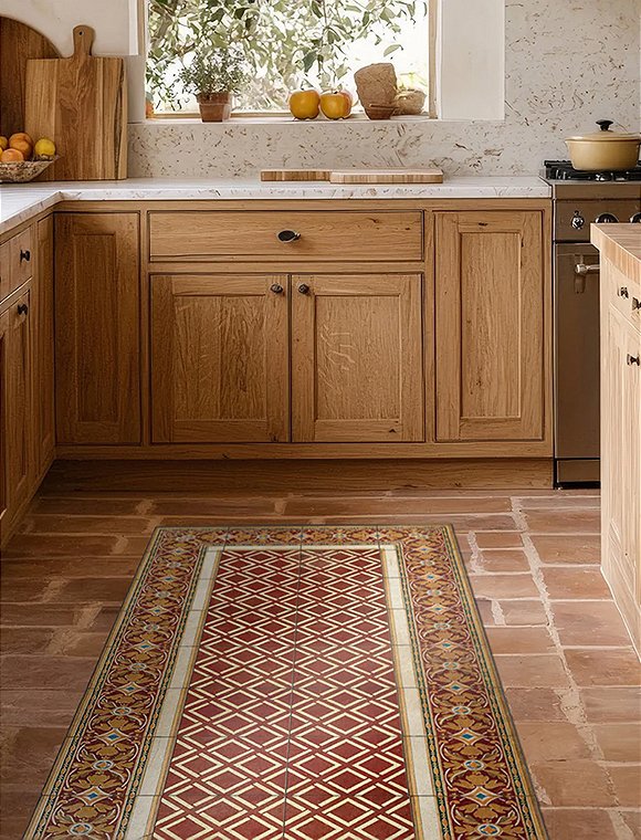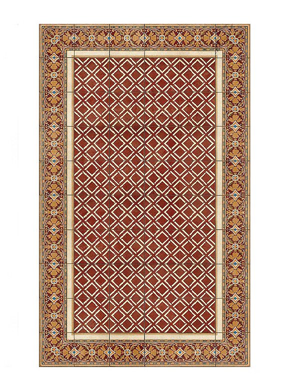 Der Vinylteppich Nicola in rot von Beija Flor sieht echten Fliesen zum Verwechseln ähnlich. Die bedruckte Vinylmatte hat ein wunderschönes Rautenmuster in Rot- und Cremetönen im Inneren und einen hell sowie mit Ornamenten verzierten Rahmen in verschiedenen braunen und roten Nuancen rundherum. Tauche deine Räume mit dem Modell Nicola in die Opulenz der kunstvoll gefertigten Vinylteppiche ein, die von königlichen Palästen inspiriert sind. Jeder Teppich dieser Kollektion ist ein Meisterwerk mit majestätischen Mustern und detailreichen Details, die die Pracht königlicher Paläste widerspiegeln. Du kannst zwischen drei verschiedenen Formaten wählen. Erlebe den Reiz von luxuriösem Komfort und Langlebigkeit. Denn die Vinylteppiche bestechen nicht nur durch zeitloses Design, sondern halten auch den Strapazen des Alltags stand. Verleihe deinem Zuhause seinen ganz individuellen Charme. Der perfekte Druck macht die Matten zu einer guten Alternative zu einem neuen Fußboden und auf Holz oder einfachen Fliesen sind sie besonders attraktiv. Oft reicht schon eine kleine Vinylmatte aus um das Gesicht des Raumes zu verändern, und man kann sich das mühevolle Herausreißen des Fußbodens ersparen. Gereinigt wird die bedruckte Matte einfach mit Wasser und Seife.