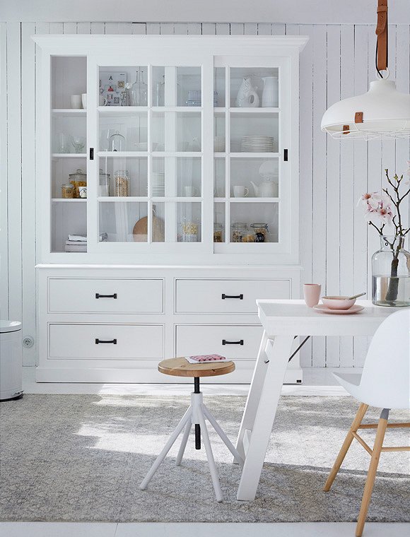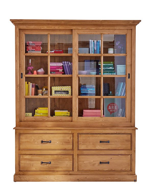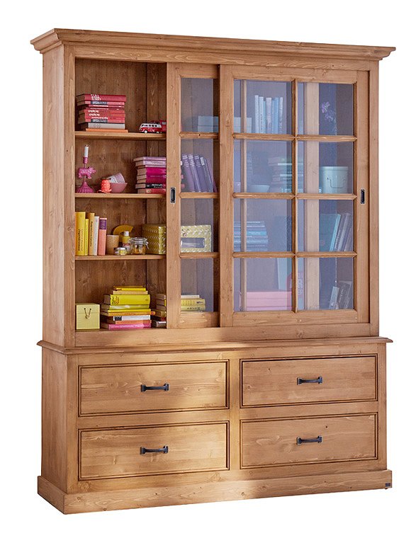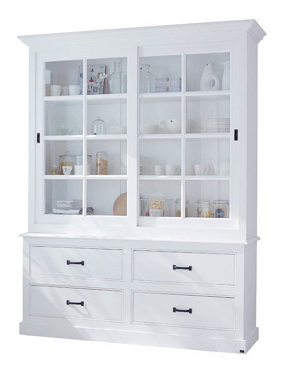 Landliebe! Die praktische wie schöne Vitrine mit Schiebetüren und Schubladen schafft jede Menge Ordnung im täglichen Chaos. Groß genug für Küchen- und Arbeitsutensilien bietet sie auf sehr charmante Weise viel Platz, und macht sich daher schnell unentbehrlich. Die Landhausvitrine ist in 16 unterschiedlichen Farben erhältlich (sichtbarer Pinselstrich) und aus massiver Kiefer gefertigt. Die Glasschiebetüren haben eingelassene Griffmulden und laufen auf Holzleisten - der Oberschrank wird mit drei Einlegeböden geliefert. Der Unterschrank hat vier große Schubladen inklusive Griffe. Die sichtbare Rückwand besteht aus massiven Holzbrettern in Nut- und Feder Optik und verleiht dem Schrank sein ländliches Aussehen. Beide Teile (Schubladenkommode und Vitrinenaufsatz) werden fertig montiert versendet. Sie können bei uns auch nur die Schubladenkommode bestellen. Bitte beachte, dass alle bunten Farben (ausgenommen weiß), eine Sonderanfertigung für dich sind - und somit vom Umtausch ausgeschlossen.