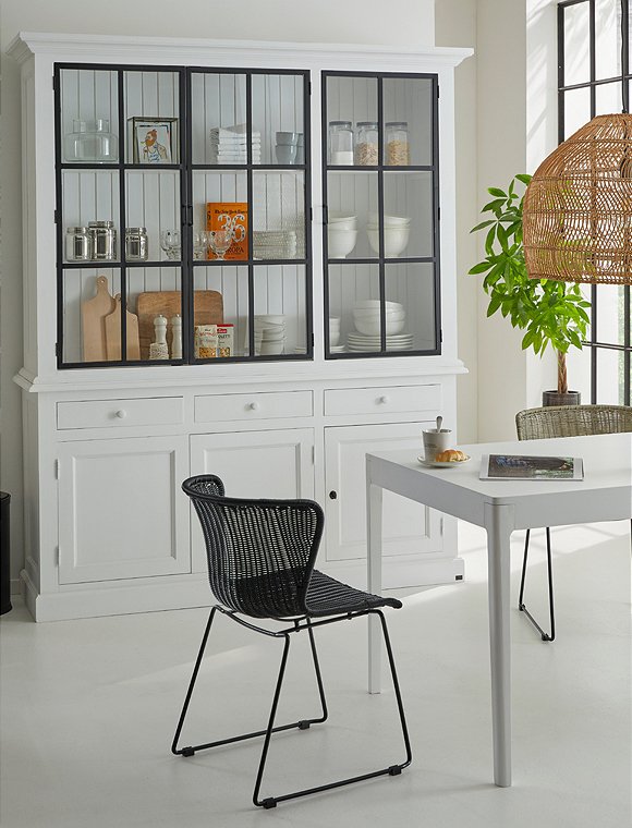 Ganz große Landhausliebe! Den wunderschönen Vitrinenschrank mit Metalltüren gibt es in 15 Farben - er vereint klassische Elemente des beliebten Landhausstils und schafft ganz nebenbei den Sprung zum modernen Design dank klarer Linien und einem spannenden Materialmix. Das Modell ist aus massiver Kiefer gefertigt und in den unterschiedlichen Farben mit einem sichtbaren Pinselstrich gestrichen. Die drei Glastüren setzen mit ihrem schwarzen Metallrahmen, den dunklen Sprossen und ihrer beeindruckenden Höhe einen modernen Kontrast. Da werden definitiv alle Blicke auf die Schätze der Vitrine gezogen. Hier im oberen Teil kannst du in insgesamt drei Fächern über die gesamte Breite des Schrankes dein edelstes Geschirr, Gläser sowie die schönsten Accessoires präsentieren. Die sichtbare Rückwand der Vitrine besteht aus massiven Holzbrettern in Nut- und Feder Optik und verleiht dem Schrank sein ländliches Aussehen. Im unteren Teil des Schrankes kannst du wahlweise in drei Schubladen sowie in je zwei Fächern hinter den aufwändig gearbeiteten Kassettentüren ganz viel weiteres Geschirr, Küchentextilien, Schüsseln und vieles andere mehr verstauen. Ganz gleich, wo die große Landhausvitrine in deinem Zuhause ihren Platz findet - sie verleiht jedem Wohnraum, der großen Diele, der Küche oder auch dem Flur eine unglaubliche Präsenz und eine besonders anmutige Atmosphäre. Beide Teile (Kommode und Vitrinenaufsatz) werden fertig montiert versendet. Je nach Bedarf kannst du die Kommode auch einzeln bei uns bestellen. Hole dir mit dem großen Vitrinenschrank mit Metalltüren ein langlebiges Möbelstück, welches Tradition und zeitloses Design verknüpft, in dein Zuhause. Wir wünschen dir ganz viel Freude damit. Bitte beachte, dass alle bunten Farben (ausgenommen weiß), eine Sonderanfertigung für dich sind - und somit vom Umtausch ausgeschlossen.