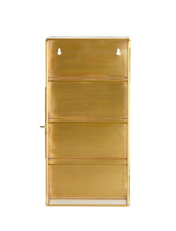 Toller, dekorativer Wandschrank Ada von Nordal aus Messing beschichtetem Metall. Den süßen Schrank gibt es in drei unterschiedlichen Größen - er wird mit zwei Schrauben durch die Rückseite sichtbar befestigt. Du kannst den kleinen Schrank für Bad- und die Küchenaccessoires nutzen oder du nimmst ihn ganz einfach für deine Sammlungen - die Schränke haben eine geringe Tiefe - daher eignen sie sich prima dafür. Die Vitrine hat eine Rückseite aus Metall, die restlichen Seiten und die Tür sind aus Glas. Die Glastür wird mit einem einfachen Schiebemechanismus verschlossen, die Regalböden sind festgelegt. Der Wandschrank Ada von Nordal lässt sich wunderbar kombinieren und bringt jede Menge Glanz in deine Wohnung - viel Spaß beim Dekorieren