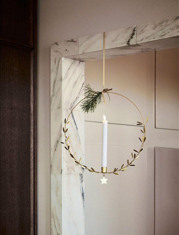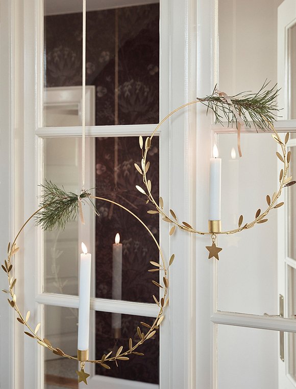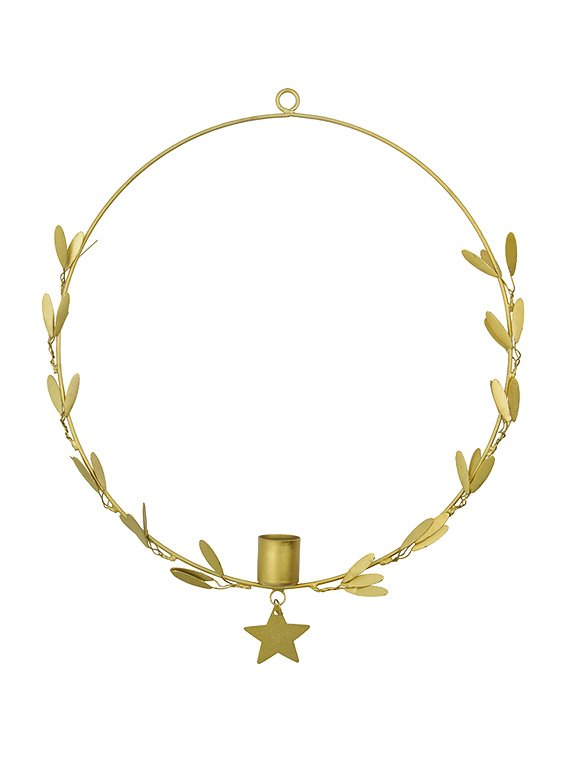 Kerzen sind nicht nur auf dem Tisch ein Hingucker... weihnachtlicher Kerzenhalter von house doctor und du kannst zu Weihnachten das Licht von der Decke hängen lassen. Der hängende Kerzenhalter mit Messingoptik, Blättern und einem Stern lässt sich prima oben mit einem Band schmücken. Danach einfach eine LED-Kerze hinzufügen und fertig ist der elegante Blickfang. Ideal für Ecken in der Wohnung, die keinen Platz für normale Kerzenhalter bieten. Für eine individuelle Note, kannst du den Ring mit leichtem Schmuck oder ein paar Zweigchen dekorieren. Du kannst den runden Kerzenhalter in zwei unterschiedlichen Größen bestellen - Ø 25 und Ø 35 cm. Aufgrund der Größe des Kerzenhalters empfehlen wir dir die LED-Kerzen des dänischen Labels mit maximal 16 cm. Hab viel Spaß am dekorieren mit dem weihnachtlichen Kerzenhalter von house doctor.Details: