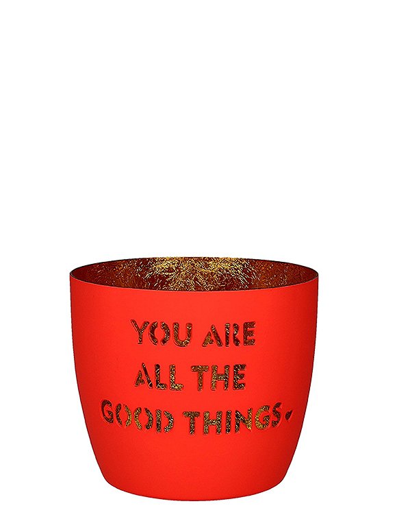 Außen matt und innen gold glänzend. Die hübschen Windlichter aus Metall von GIFTCOMPANY geben ein tolles Licht. Ob auf dem Tisch, der Konsole oder einem Tablett arrangiert, allein oder doch lieber in der Gruppe, bleibt dir überlassen. Die hübschen Modelle sind aus Metall gefertigt und von außen je mit einer zarten Pastellfarbe in rosa, blau, beige, sand oder weiß matt beschichtet oder in neon und vielen anderen schönen Farben. Die goldene Oberfläche im Inneren lässt das Kerzenlicht besonders warm erstrahlen. Schönes Detail: Die Schriftzüge sind ausgestanzt und lassen den goldenen Kerzenschein durchschimmern. So bieten uns die Windlichter im Handumdrehen eine warme, sehr persönliche Dekoration - und sind in jedem Falle immer eine schöne Geschenkidee zur Geburt, zum Geburtstag, zum Einzug oder einfach nur mal so. Wir wünschen viel Spaß beim Dekorieren mit den Windlichtern aus Metall von GIFTCOMPANY.Details: