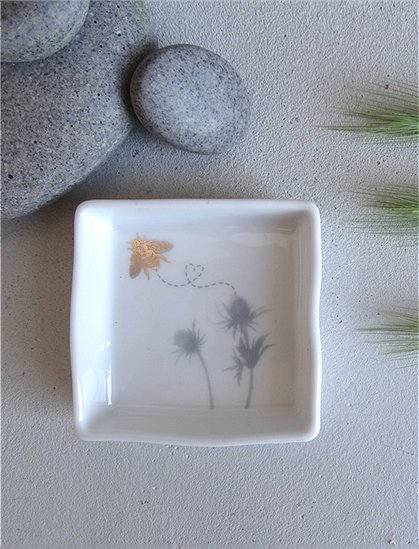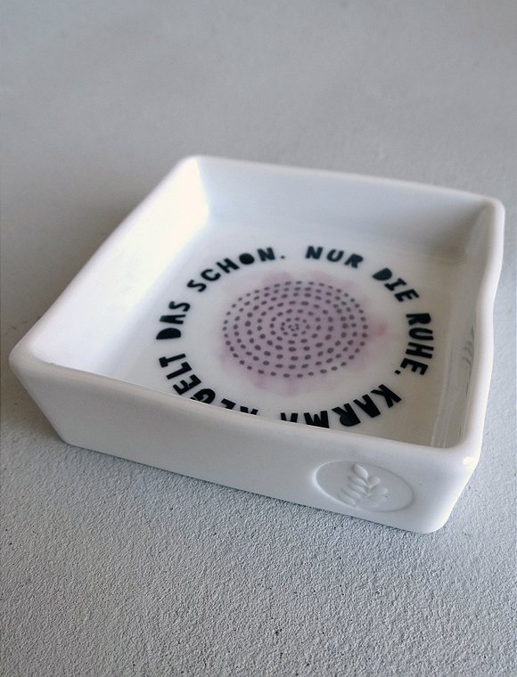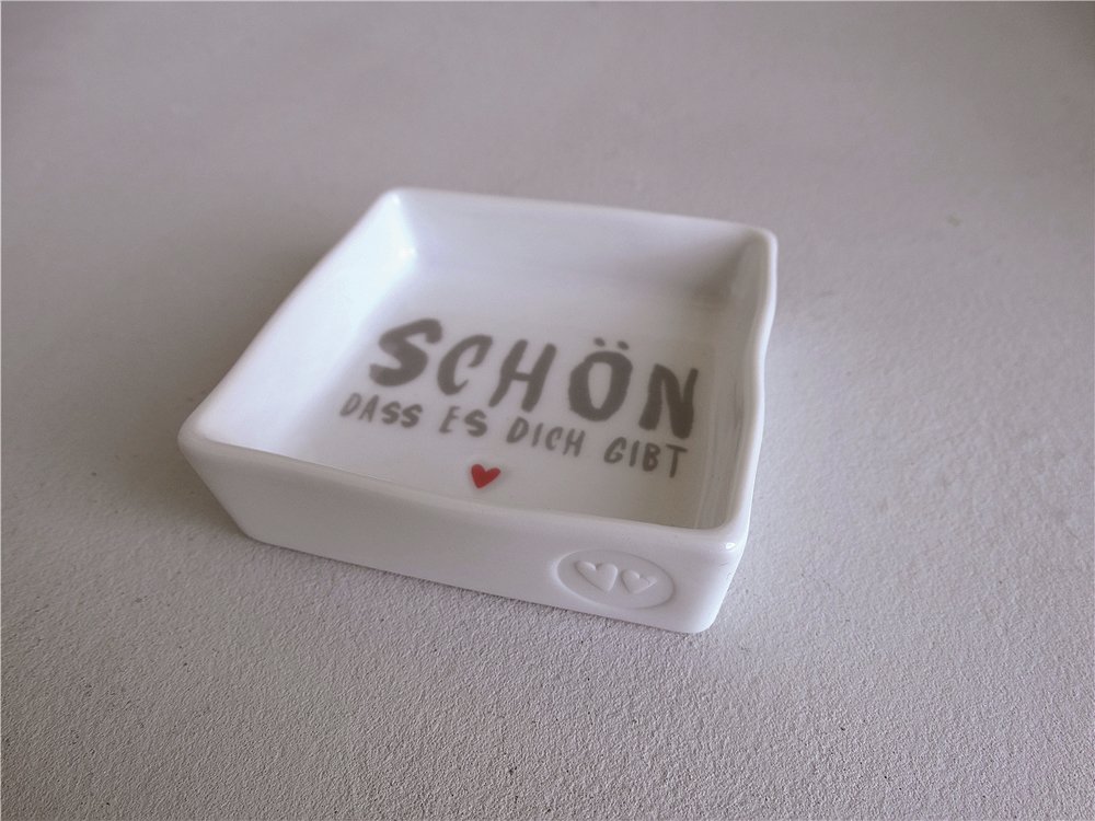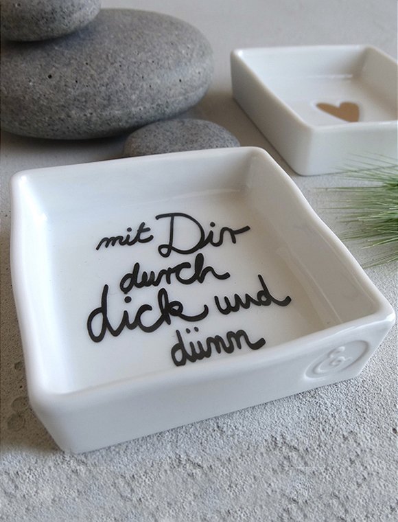 Süße Botschaft. Die kleinen Wunschschälchen von Good old friends überbringen liebe Nachrichten und machen gute Laune. Die quadratische Schale aus weißem Porzellan ist im Inneren mit kleinen Motiven wie einem goldenen Herz, einer Biene oder charmanten Sprüchen wie "Mit Dir durch dick und dünn", ""Her mit dem schönen Leben" oder "Schön, dass es Dich gibt" versehen. Du kannst zwischen sechs Motiven wählen. Sie eignet sich prima als Ablage für Schmuck, den Haustürschlüssel oder einfach nur als dekoratives Accessoire auf der Fensterbank, dem Wandregal oder deinem Schreibtisch. Besonders schönes Detail: Am vorderen Rand hat jedes Schälchen außen ein kleines Symbol eingeprägt. Ein süßes Herz oder eine Sonne sind ein hübscher Blickfang auf den bezaubernden Mini Schalen. Verschenke Freude an andere oder hole dir selbst gute Laune und ein wunderschönes Wohnaccessoire in dein Zuhause mit den süßen Wunschschälchen von Good old friends. Tipp: Für kleine Schmuckgeschenke ist das Schälchen die ideale Geschenkverpackung! Viel Freude damit!