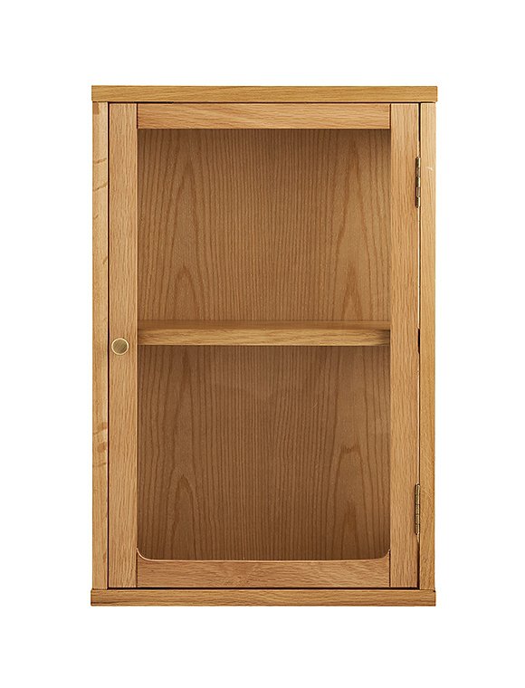 Maße (HxTxB):60 x 20 x 40 cmMaterial: massiver Eichenrahmen mit Türfronten aus Eichenfurnier/Glas, MetallgriffEiche, FSC zertifiziert